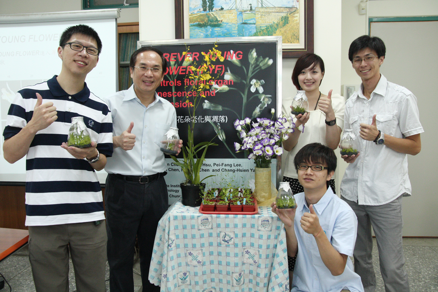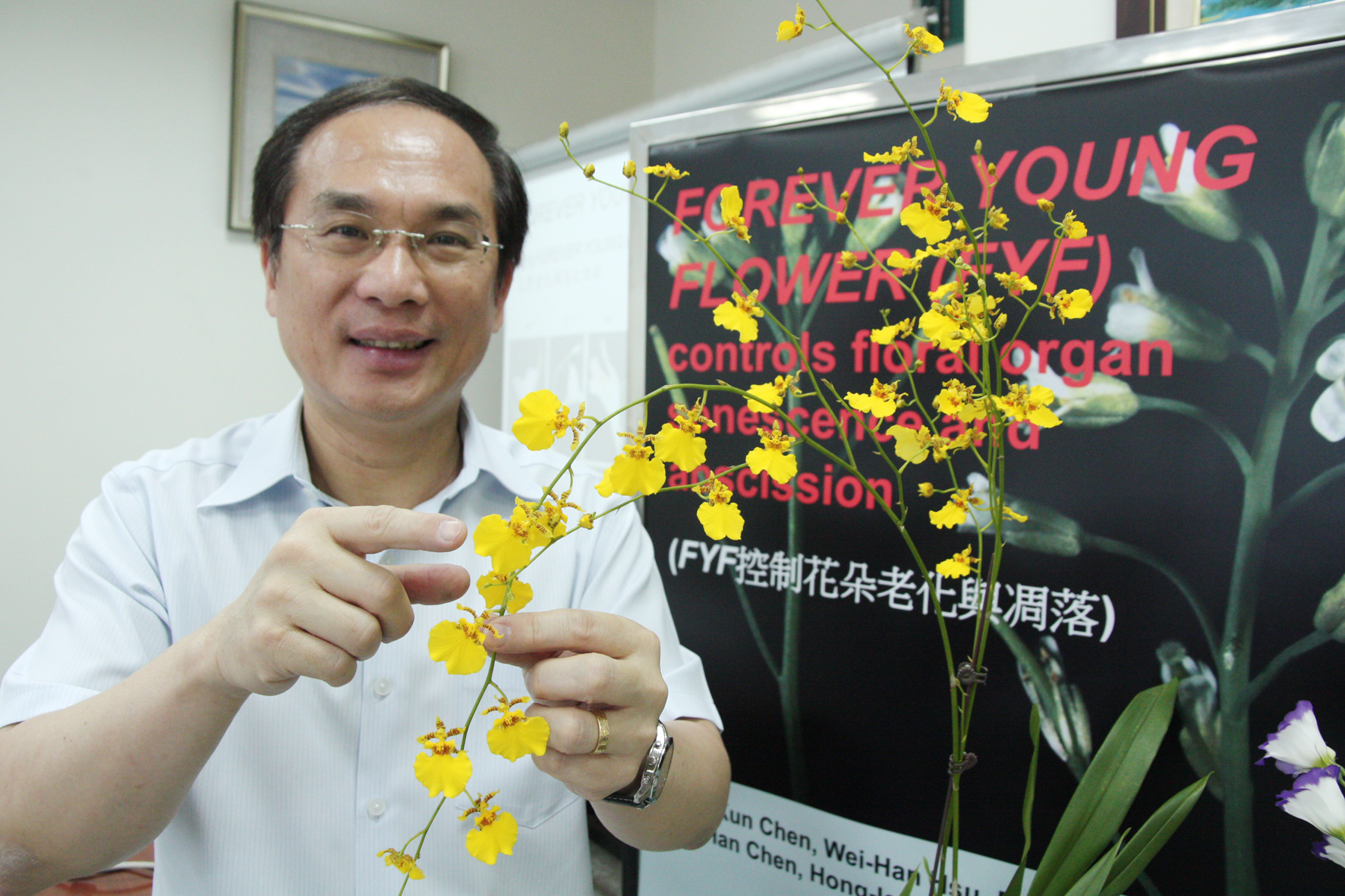 【圖/媒體公關組.文/楊長賢】花期不夠長是許多花卉栽培產業目前面臨的重要瓶頸之一,延長花的櫥架壽命,對於提高台灣花卉外銷的競爭力將有很大的助益。國立中興大學生物科技學研究所教授楊長賢所領導的研究團隊,日前發現花朵中的MADS box基因Forever Young Flower (FYF)能有效抑制導致花朵老化的植物激素乙烯(ethylene)的作用路徑,進而控制花朵的老化凋落,此成果已刊登於國際植物學前5%的頂尖期刊The Plant Journal。