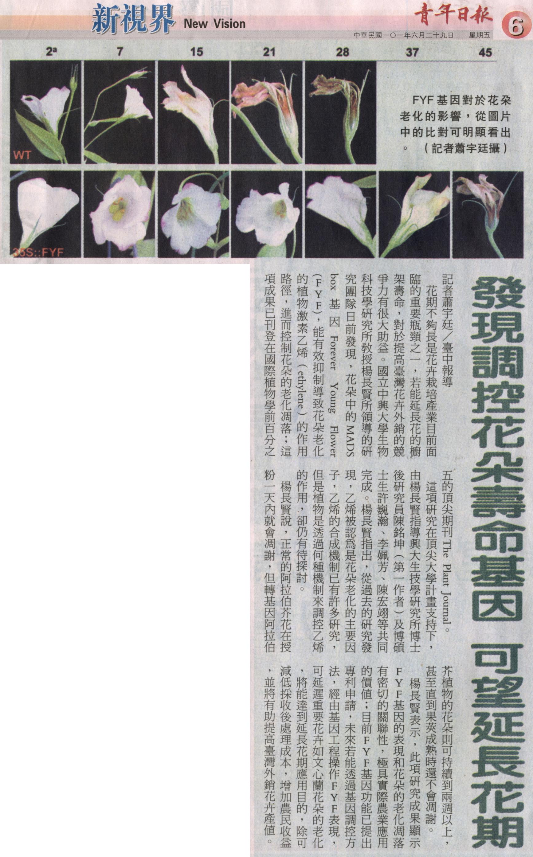 花期不夠長是花卉栽培產業目前面臨的重要瓶頸之一,若能延長花的櫥架壽命,對於提高臺灣花卉外銷的競爭力有很大助益。國立中興大學生物科技學研究所教授楊長賢所領導的研究團隊日前發現,花朵中的MADS box基因Forever Young Flower (FYF),能有效抑制導致花朵老化的植物激素乙烯(ethylene)的作用路徑,進而控制花朵的老化凋落;這項成果已刊登在國際植物學前百分之五的頂尖期刊The Plant Journal。