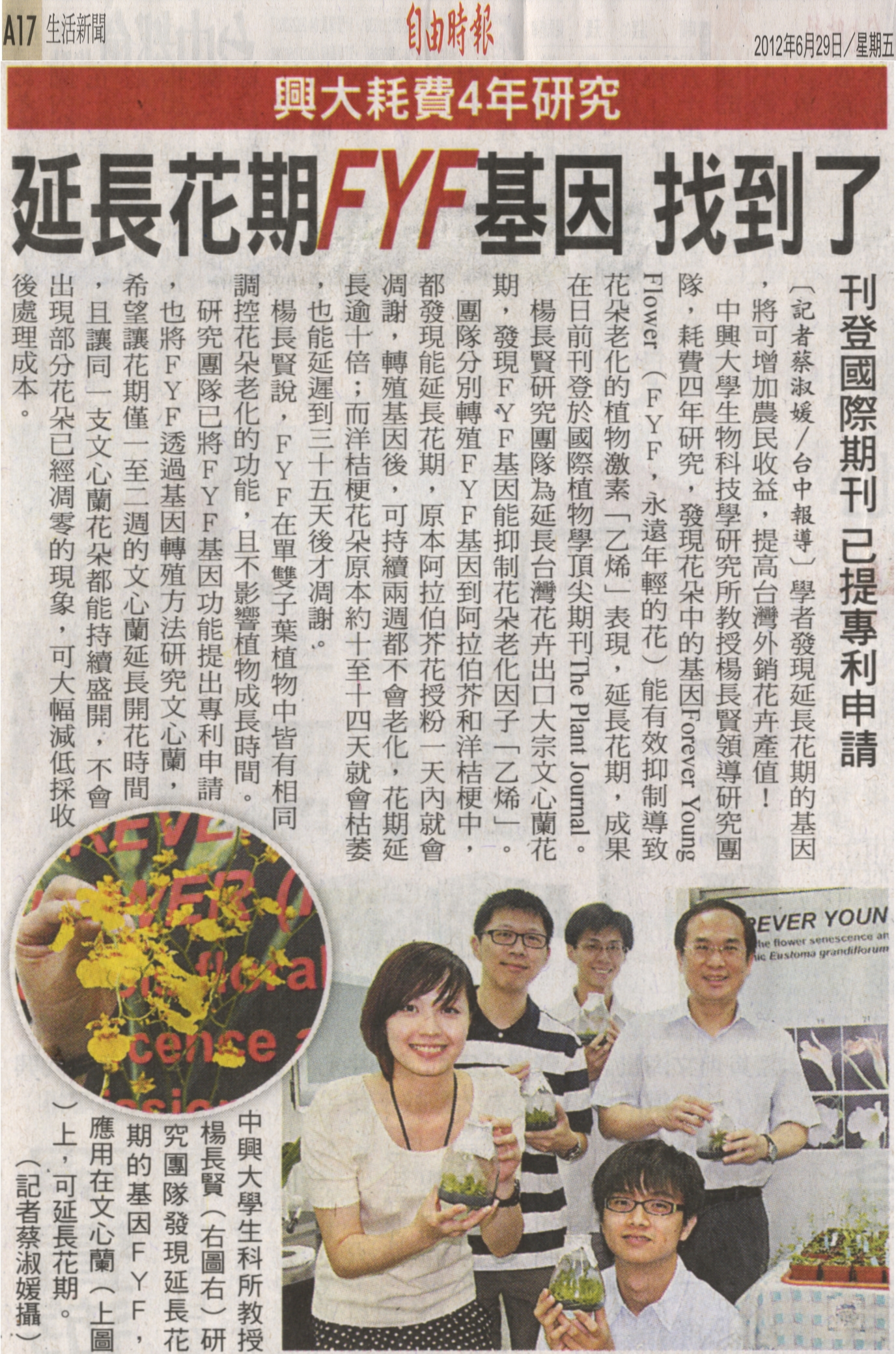 中興大學生物科技學研究所教授楊長賢領導研究團隊,耗費四年研究,發現花朵中的基因Forever Young Flower (FYF,永遠年輕的花)能有效抑制導致花朵老化的植物激素「乙烯」表現,延長花期,成果在日前刊登於國際植物學頂尖期刊The Plant Journal。