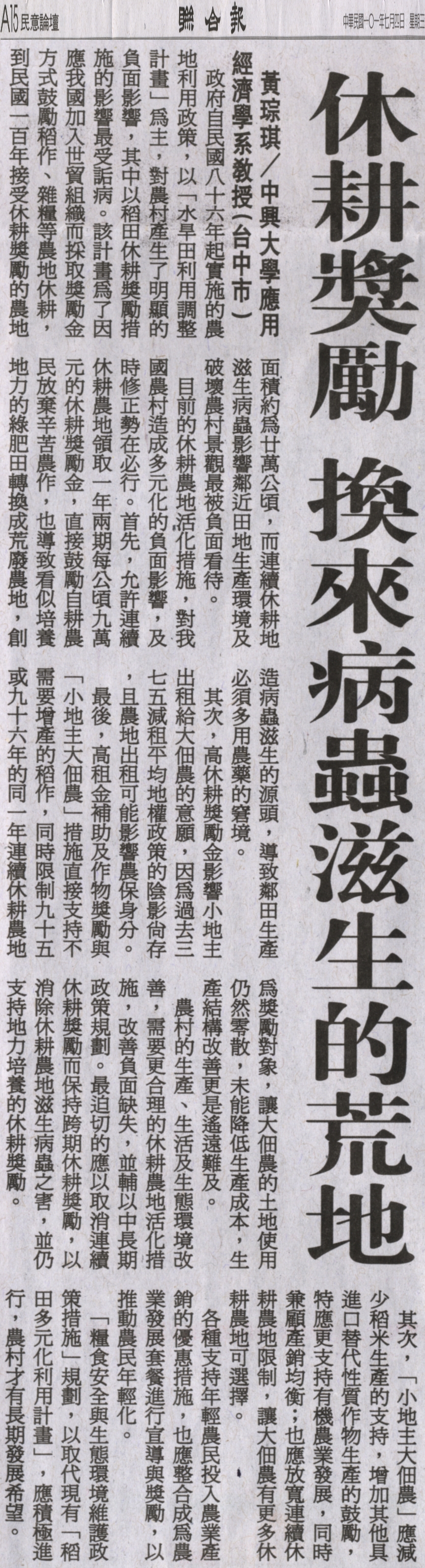 目前的休耕農地活化措施,對我國農村造成多元化的負面影響,及時修正勢在必行。首先,允許連續休耕農地領取一年兩期每公頃九萬元的休耕獎勵金,直接鼓勵自耕農民放棄辛苦農作,也導致看似培養地力的綠肥田轉換成荒廢農地,創造病蟲滋生的源頭,導致鄰田生產必須多用農藥的窘境。