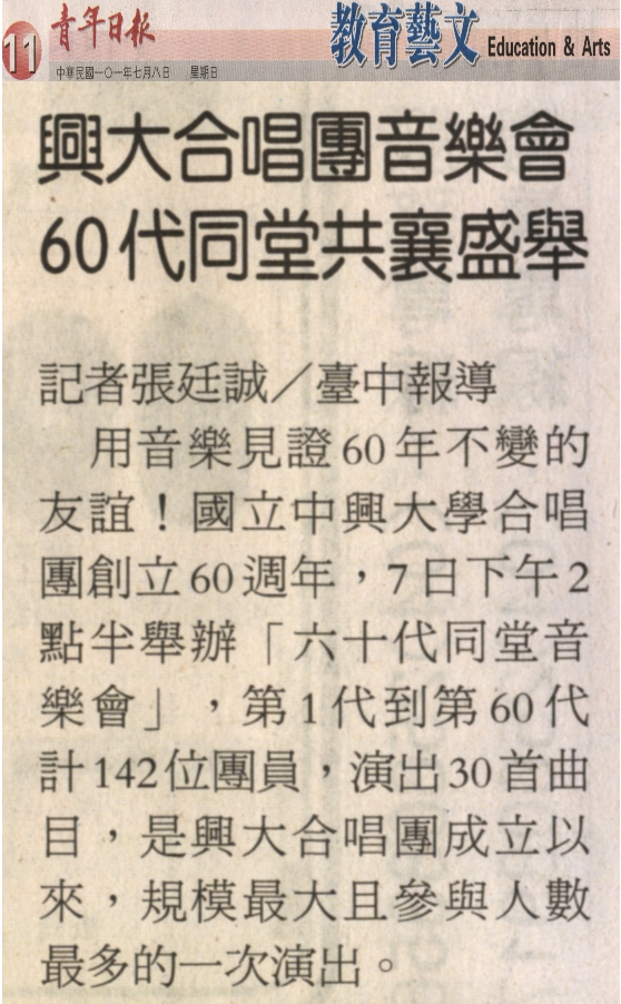 【媒體報導】興大合唱團音樂會 60代同堂共襄盛舉