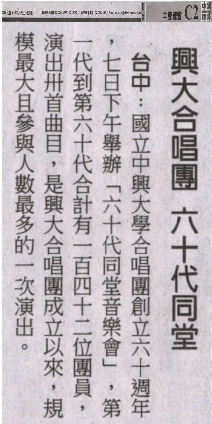台中:國立中興大學合唱團創立六十週年,七日下午舉辦「六十代同堂音樂會」,第一代到第六十代合計有一百四十二位團員,演出卅首曲目,是興大合唱團成立以來,規模最大且參與人數最多的一次演出。