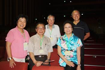 第一代團友卓仁祥(左2)與第二代團友伍巧雲(右2)特地從美國返台參與演出,指揮吳榮桂(右1)擔任興大合唱團指導40年凝聚團友向心力,活動執行長李中玲(左1)負責籌辦 |
