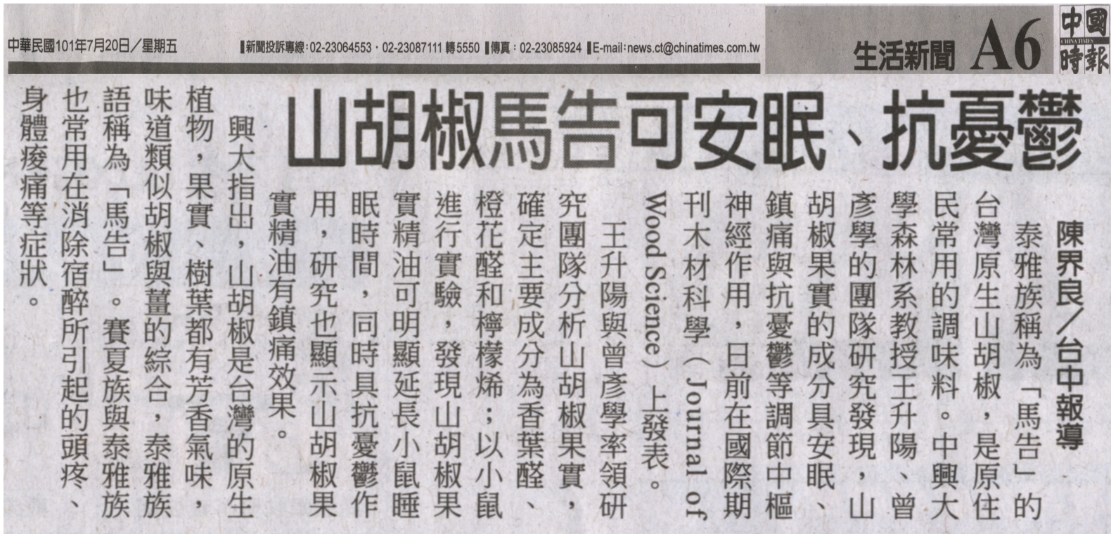 泰雅族稱為「馬告」的台灣原生山胡椒,是原住民常用的調味料。中興大學森林系教授王升陽、曾彥學的團隊研究發現,山胡椒果實的成分具安眠、鎮痛與抗憂鬱等調節中樞神經作用,日前在國際期刊木材科學(Journal of Wood Science)上發表。