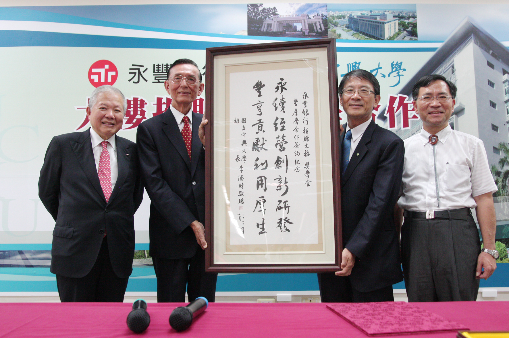 永豐銀董事長邱正雄與興大校長李德財代表雙方簽署捐贈契約書暨產學合作協議。該大樓初步規劃興建地下二層與地上九層,總樓地板面積約3328坪,主要用途為食品安全與農業資材(包含抗生素藥物、病原微生物等)檢測研發試驗,以及認證推廣的服務。