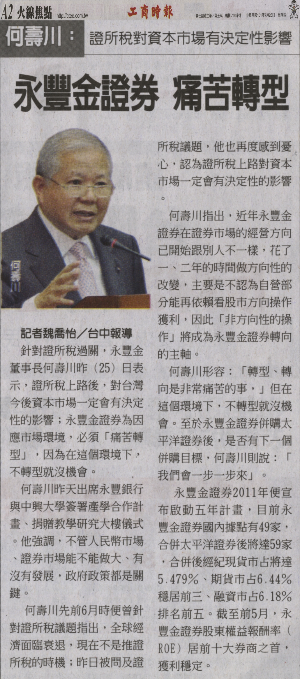 針對證所稅過關,永豐金董事長何壽川昨(25)日表示,證所稅上路後,對台灣今後資本市場一定會有決定性的影響;永豐金證券為因應市場環境,必須「痛苦轉型」,因為在這個環境下,不轉型就沒機會。