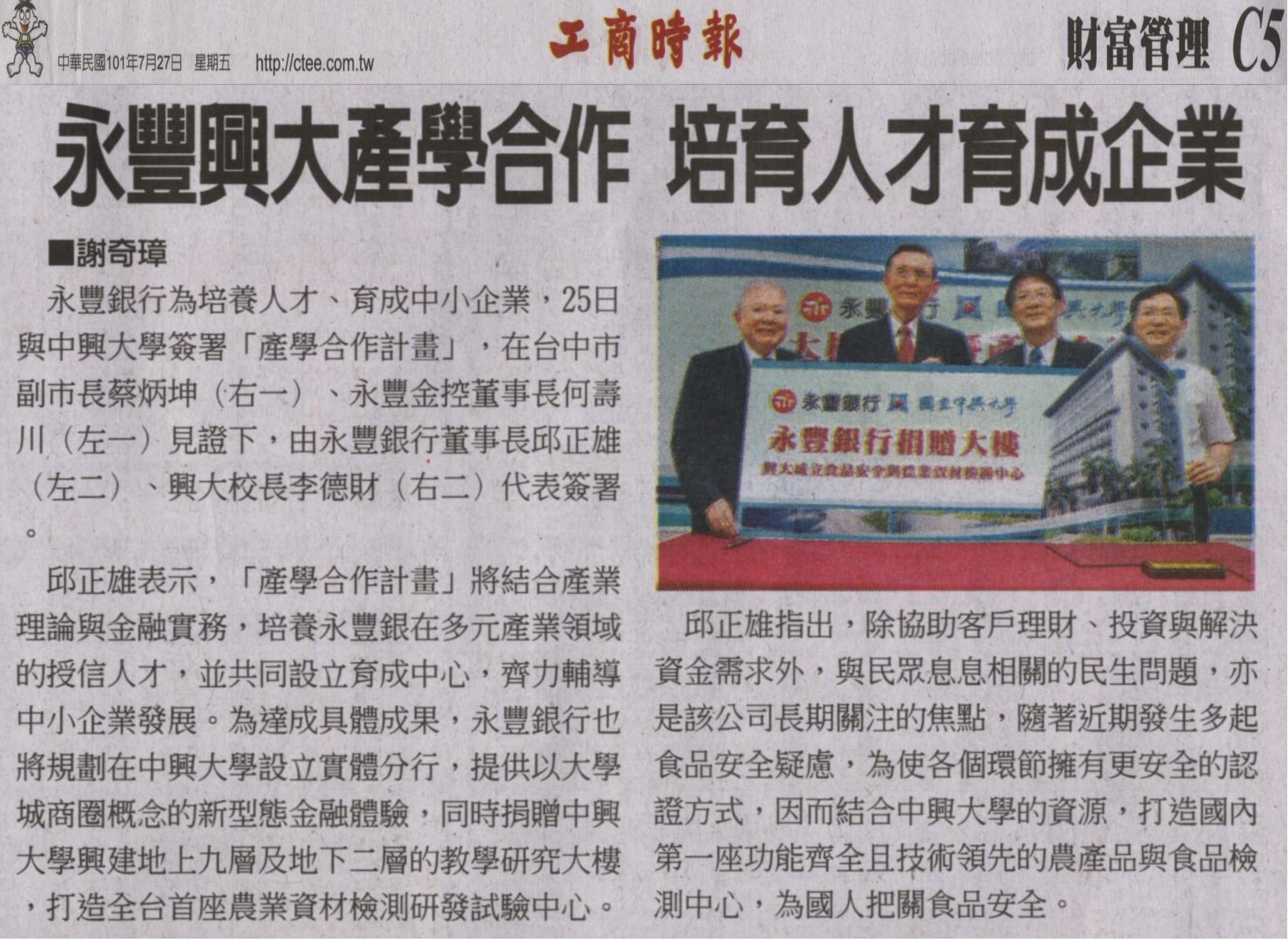 邱正雄表示,「產學合作計畫」將結合產業理論與金融實務,培養永豐銀在多元產業領域的授信人才,並共同設立育成中心,齊力輔導中小企業發展。為達成具體成果,永豐銀行也將規劃在中興大學設立實體分行,提供以大學城商圈概念的新型態金融體驗,同時捐贈中興大學興建地上九層及地下二層的教學研究大樓,打造全台首座農業資材檢測研發試驗中心。