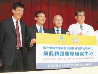 中興大學籌設醫學院已準備10年,校方相當積極,密切和台中榮總合作,興大副校長徐堯煇(左起)、校長李德財、中榮前院長王丹江、現任院長李三剛攜手成立「轉譯醫學研究中心」。 |