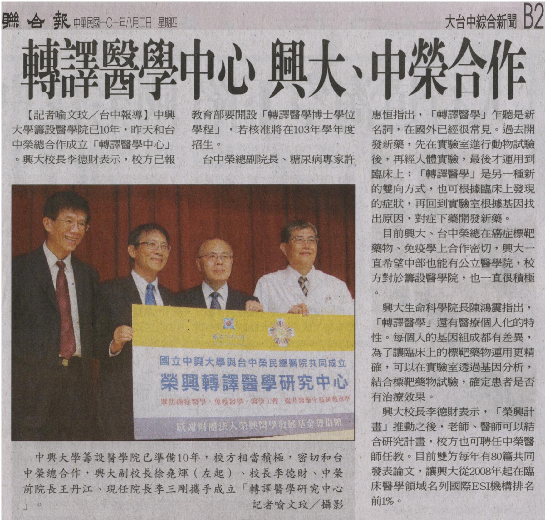 中興大學籌設醫學院已10年,昨天和台中榮總合作成立「轉譯醫學中心」。興大校長李德財表示,校方已報教育部要開設「轉譯醫學博士學位學程」,若核准將在103年學年度招生。