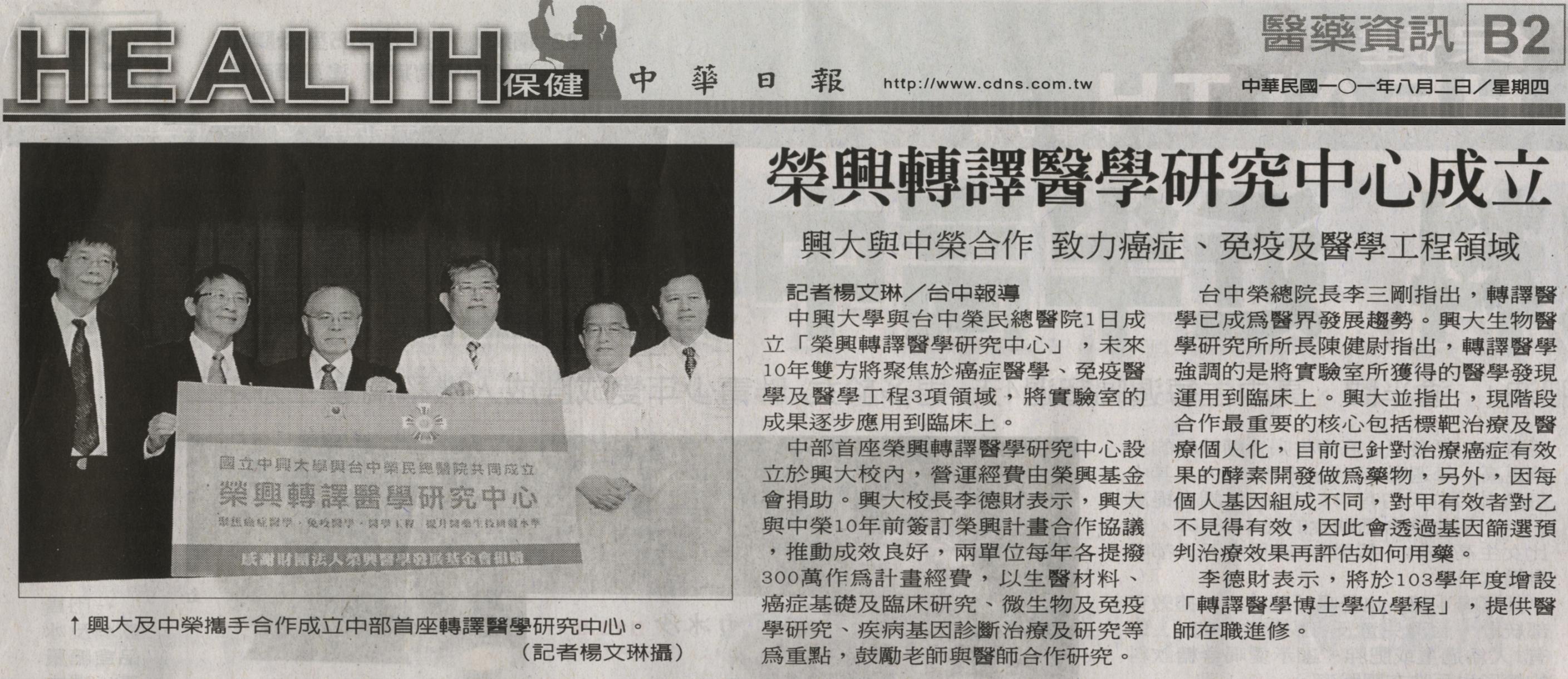 中部首座榮興轉譯醫學研究中心設立於興大校內,營運經費由榮興基金會捐助。興大校長李德財表示,興大與中榮 10年前簽訂榮興計畫合作協議,推動成效良好,兩單位每年各提撥 300萬作為計畫經費,以生醫材料、癌症基礎及臨床研究、微生物及免疫學研究、疾病基因診斷治療及研究等為重點,鼓勵老師與醫師合作研究。