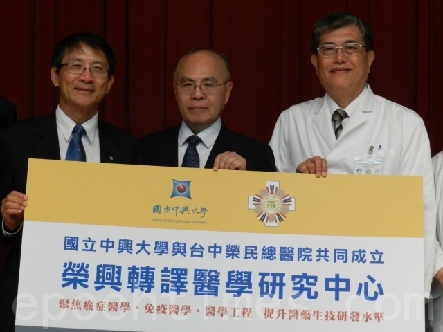 中興大學校長李德財(左一)、榮興基金會董事長王丹江(中)及台中榮總李三剛院長(右一)出席「榮興轉譯醫學研究中心」成立典禮,研究中心未來將致力於癌症醫學、免疫醫學及醫學工程三項領域,並將實驗室成果應用到臨床上。(攝影:游凱銘/大紀元) |