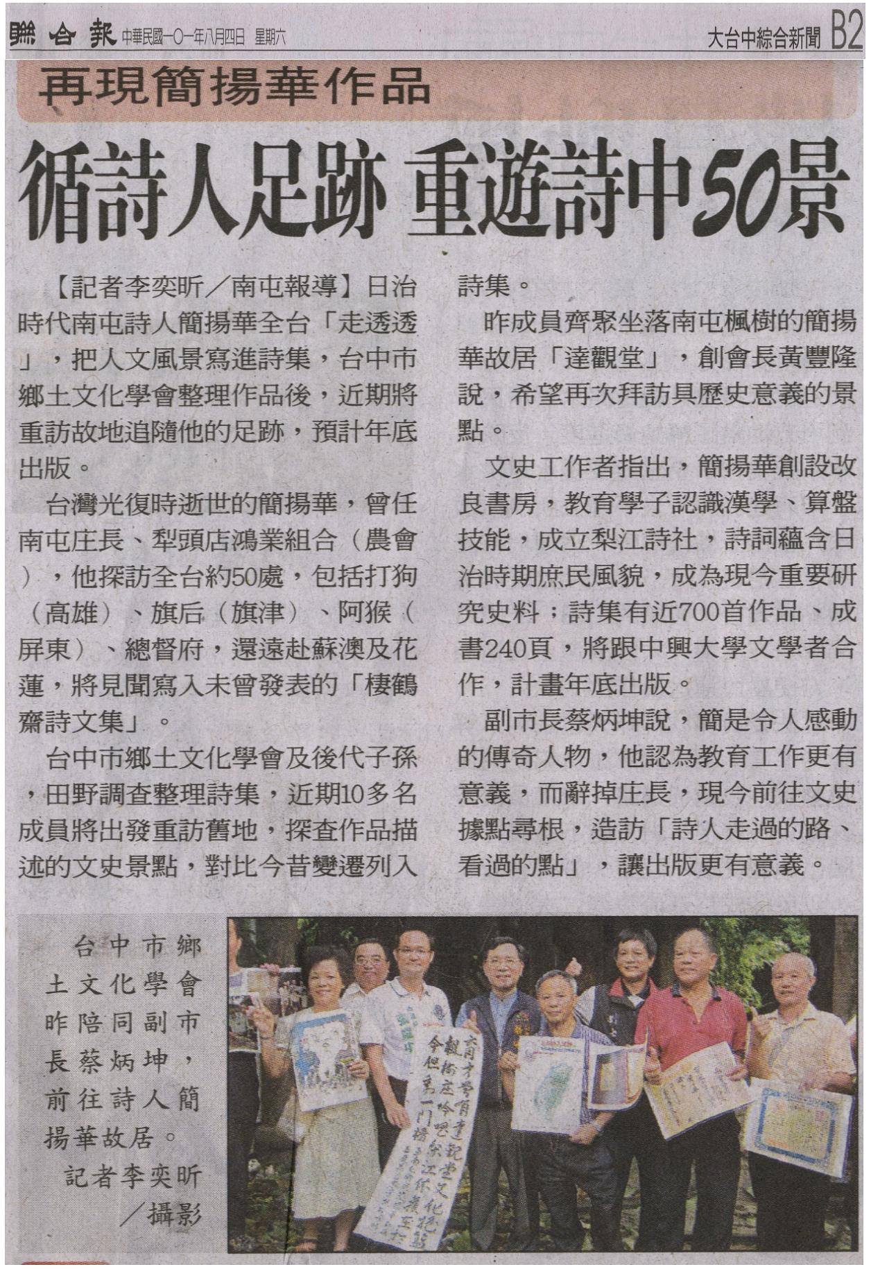 台灣光復時逝世的簡揚華,曾任南屯庄長、犁頭店鴻業組合(農會),他探訪全台約50處,包括打狗(高雄)、旗后(旗津)、阿猴(屏東)、總督府,還遠赴蘇澳及花蓮,將見聞寫入未曾發表的「棲鶴齋詩文集」。