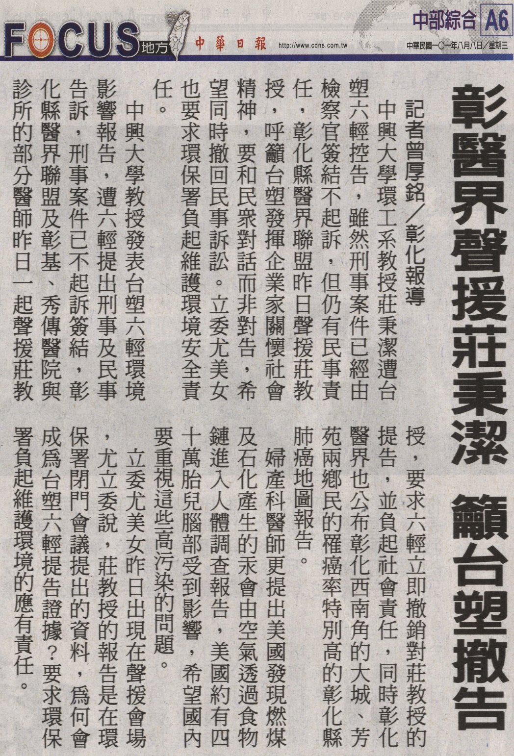 中興大學教授發表台塑六輕環境影響報告,遭六輕提出刑事及民事告訴,刑事案件已不起訴簽結,彰化縣醫界聯盟及彰基、秀傳醫院與診所的部分醫師昨日一起聲援莊教授,要求六輕立即銷對莊教授的提告,並負起社會責任,同時彰化醫界也公布彰化西南角的大城、芳苑兩鄉民的罹癌率特別高的彰化縣肺癌地圖報告。