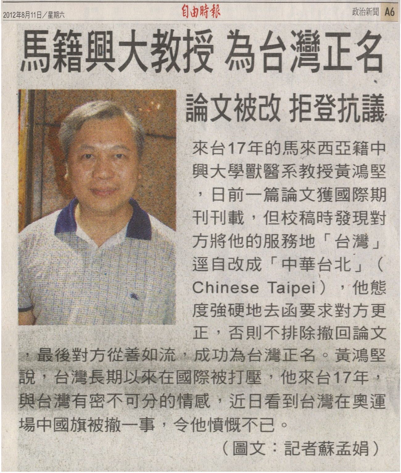來台十七年的馬來西亞籍中興大學獸醫系教授黃鴻堅,日前一篇論文獲國際期刊刊載,但校稿時發現對方將他的服務地「台灣」逕自改成「中華台北」(Chinese Taipei),他態度強硬地去函要求對方更正,否則不排除撤回論文,最後對方從善如流,成功為台灣正名。黃鴻堅說,台灣長期以來在國際被打壓,他來台十七年,與台灣有密不可分的情感,近日看到台灣在奧運場中國旗被撤一事,令他憤慨不已。