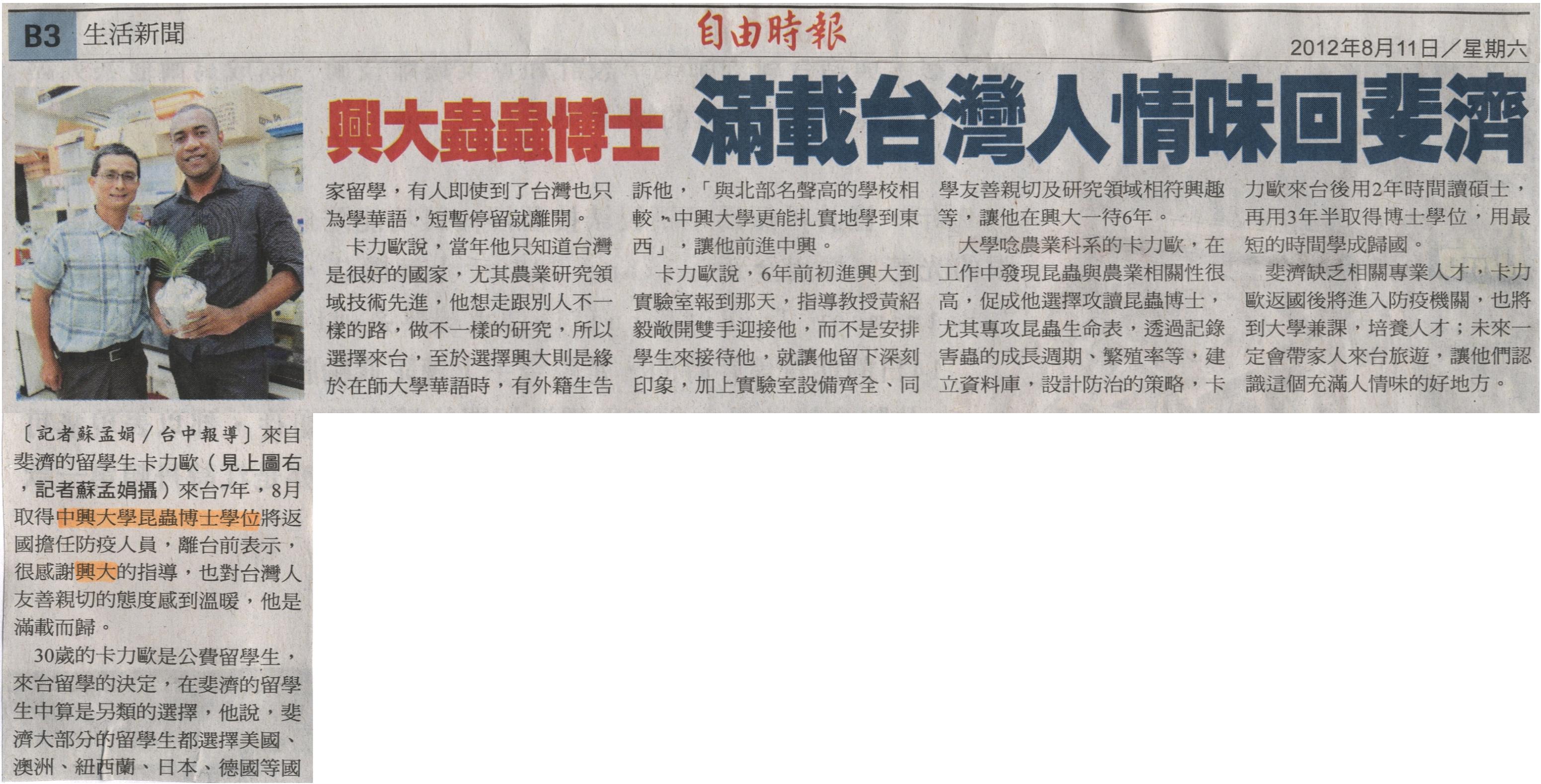 來自斐濟的留學生卡力歐來台7年,8月取得中興大學昆蟲博士學位將返國擔任防疫人員,離台前表示,很感謝興大的指導,也對台灣人友善親切的態度感到溫暖,他是滿載而歸。