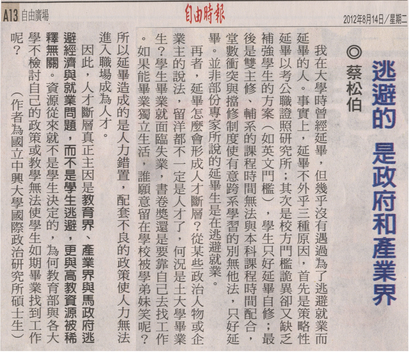 再者,延畢怎麼會形成人才斷層?從某些政治人物或企業主的說法,留洋都不一定是人才了,何況是土大學畢業生?學生畢業就面臨失業,書卷獎還是要靠自己去找工作。如果能畢業獨立生活,誰願意留在學校被學弟妹笑呢?所以延畢造成的是人力錯置,配套不良的政策使人力無法進入職場成為人才。