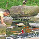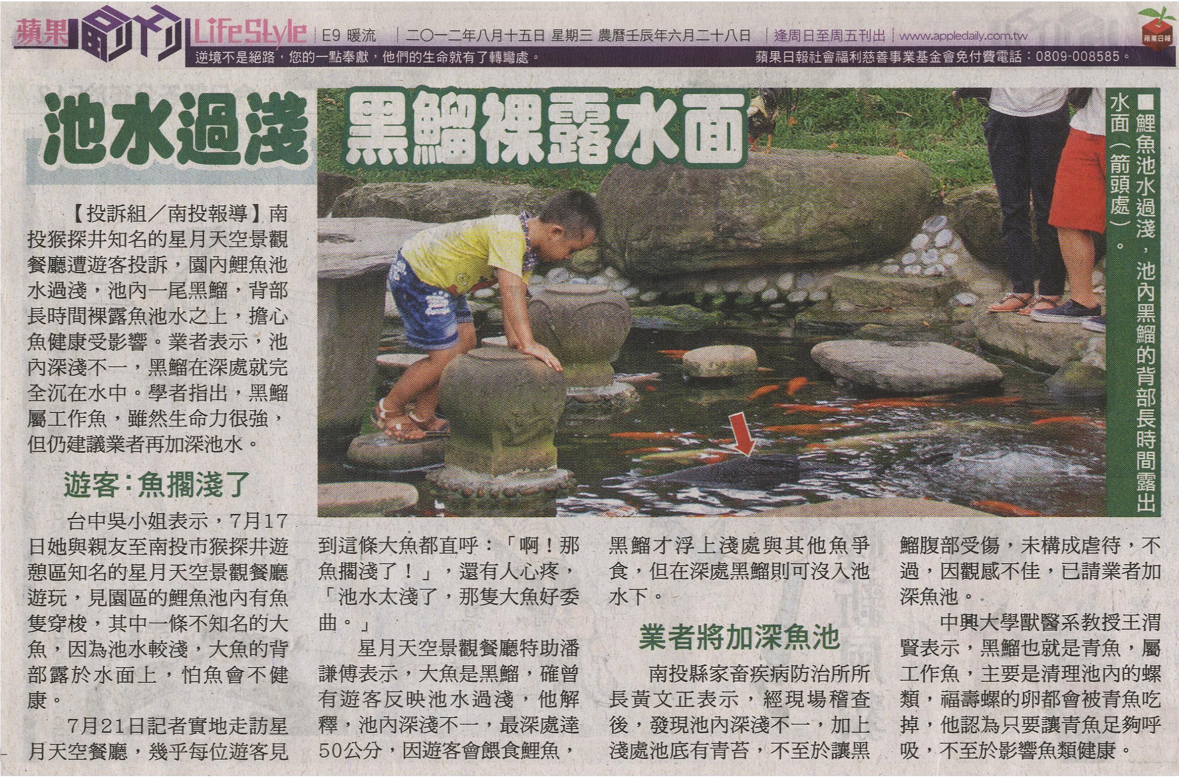 遊客:魚擱淺了 台中吳小姐表示,7月17日她與親友至南投市猴探井遊憩區知名的星月天空景觀餐廳遊玩,見園區的鯉魚池內有魚隻穿梭,其中一條不知名的大魚,因為池水較淺,大魚的背部露於水面上,怕魚會不健康。