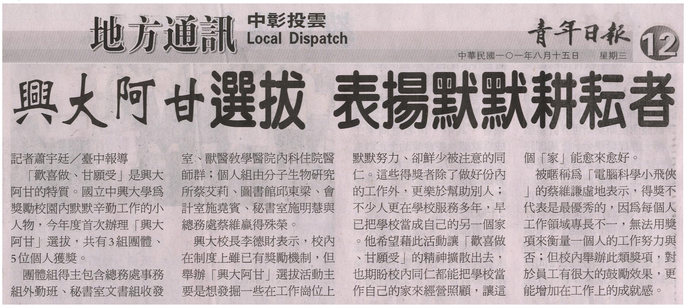 「歡喜做、甘願受」是興大阿甘的特質。國立中興大學為獎勵校園內默默辛勤工作的小人物,今年度首次辦理「興大阿甘」選拔,共有3組團體、5位個人獲獎。