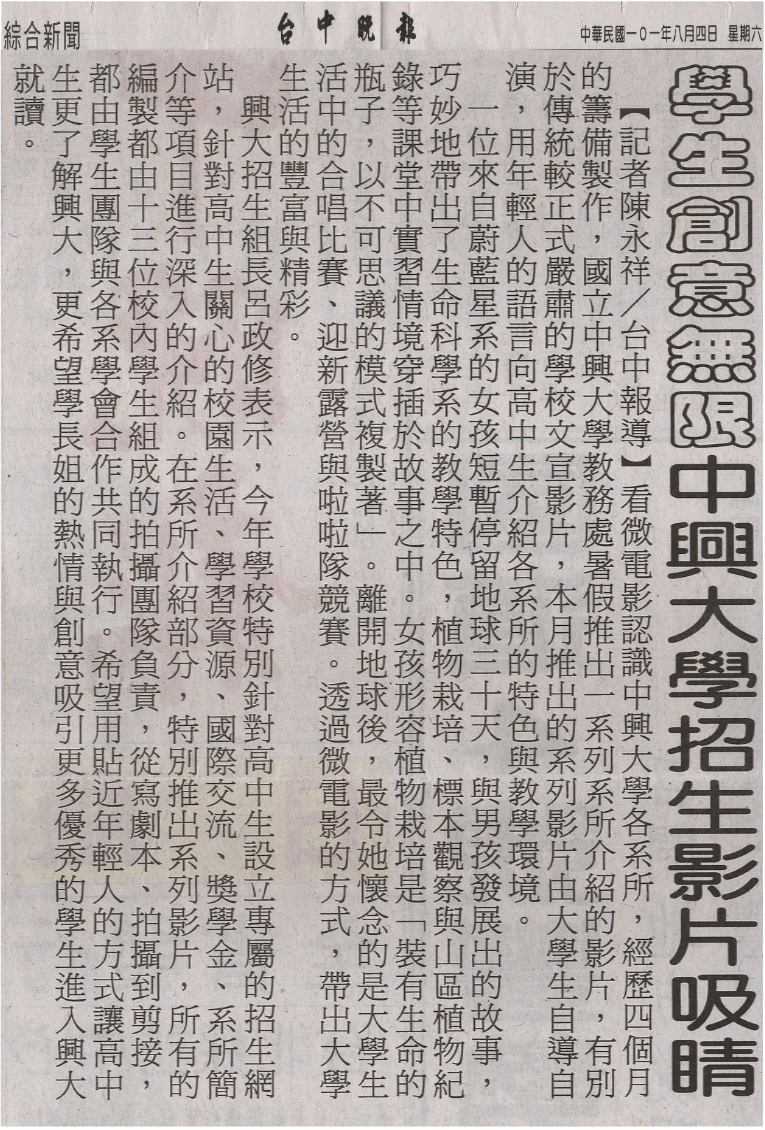 【媒體報導】學生創意無限 中興大學招生影片吸睛