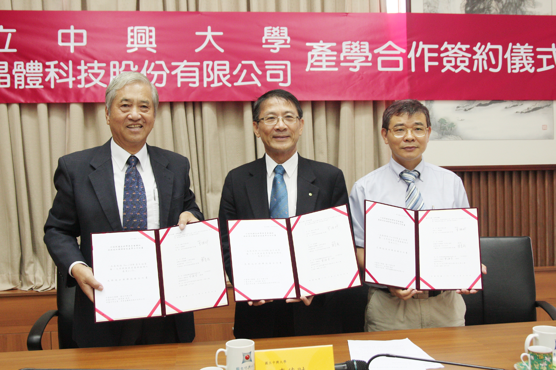 國立中興大學化學系教授林寬鋸與希華晶體科技公司20日上午簽訂產學合作,雙方將展開兩年的合作計畫,針對「高再現性的感測晶片」(Au-LSPR晶片)進行研發,未來將開發生醫感測晶片搭載可攜式感測裝置,主要用於檢測肝癌等免疫系統疾病,由於靈敏度高且成本低,有助於早期疾病之發現與治療。