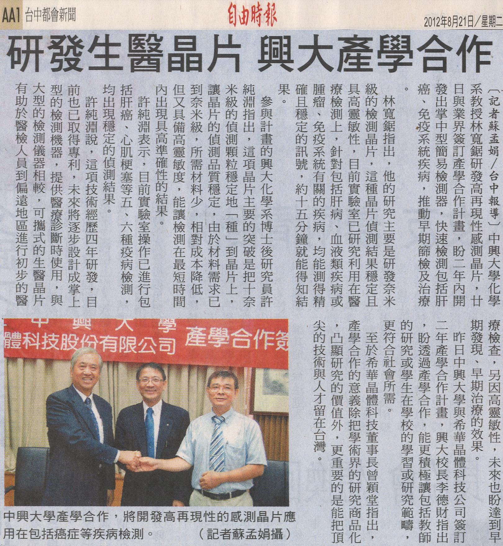 中興大學產學合作,將開發高再現性的感測晶片應用在包括癌症等疾病檢測。 |