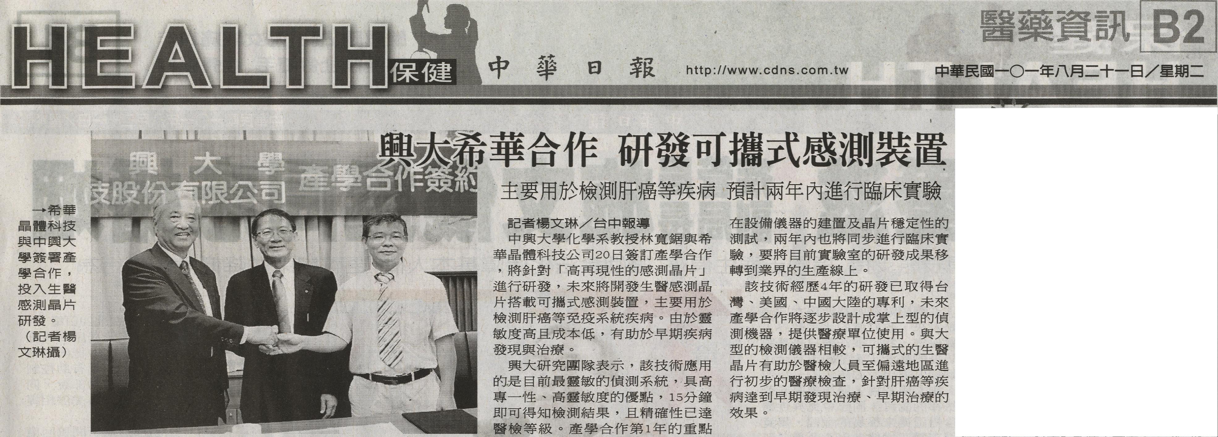 中興大學化學系教授林寬鋸與希華晶體科技公司 20日簽訂產學合作,將針對「高再現性的感測晶片」進行研發,未來將開發生醫感測晶片搭載可攜式感測裝置,主要用於檢測肝癌等免疫系統疾病。由於靈敏度高且成本低,有助於早期疾病發現與治療。