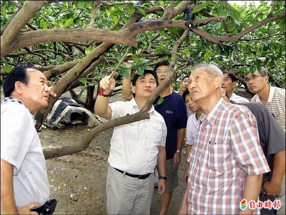 國立中興大學樹醫生劉東啟(左側著白上衣者)為柚樹健康情形把脈。(記者劉婉君攝) |