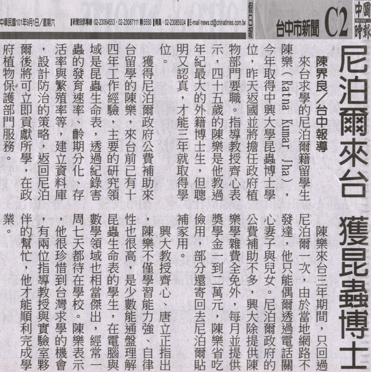 來台求學的尼泊爾籍留學生陳樂(Ratna Kumar Jha),今年取得中興大學昆蟲博士學位,昨天返國並將擔任政府植物部門要職。指導教授齊心表示,四十五歲的陳樂是他教過年紀最大的外籍博士生,但聰明又認真,才能三年就取得學位。