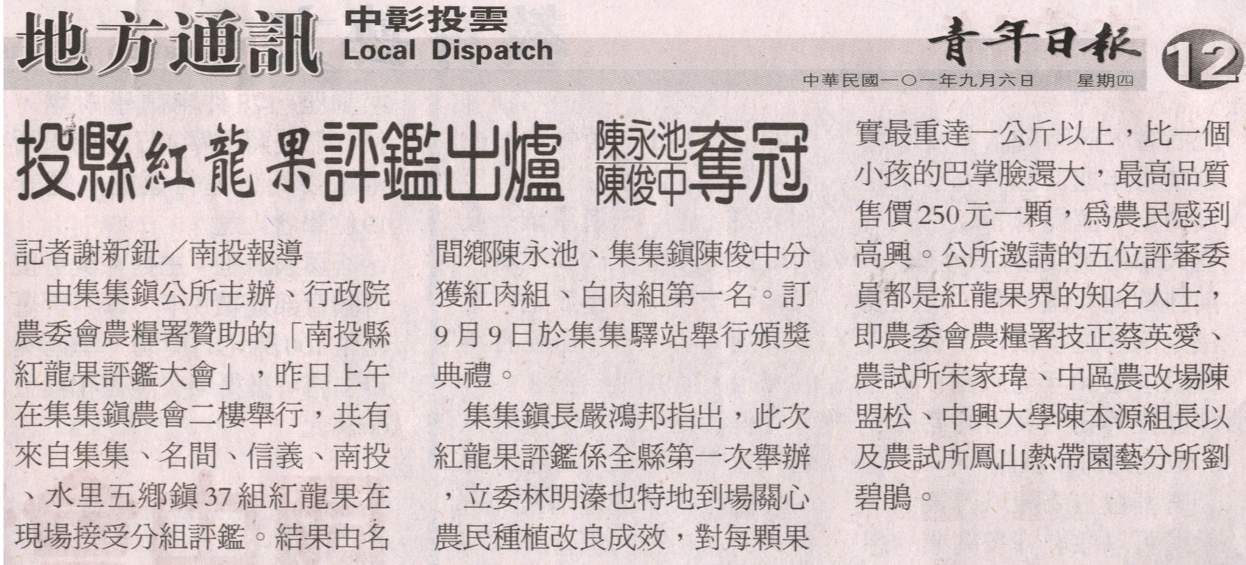 由集集鎮公所主辦、行政院農委會農糧署贊助的「南投縣紅龍果評鑑大會」,昨日上午在集集鎮農會二樓舉行,共有來自集集、名間、信義、南投、水里五鄉鎮37組紅龍果在現場接受分組評鑑。結果由名間鄉陳永池、集集鎮陳俊中分獲紅肉組、白肉組第一名。訂9月9日於集集驛站舉行頒獎典禮。