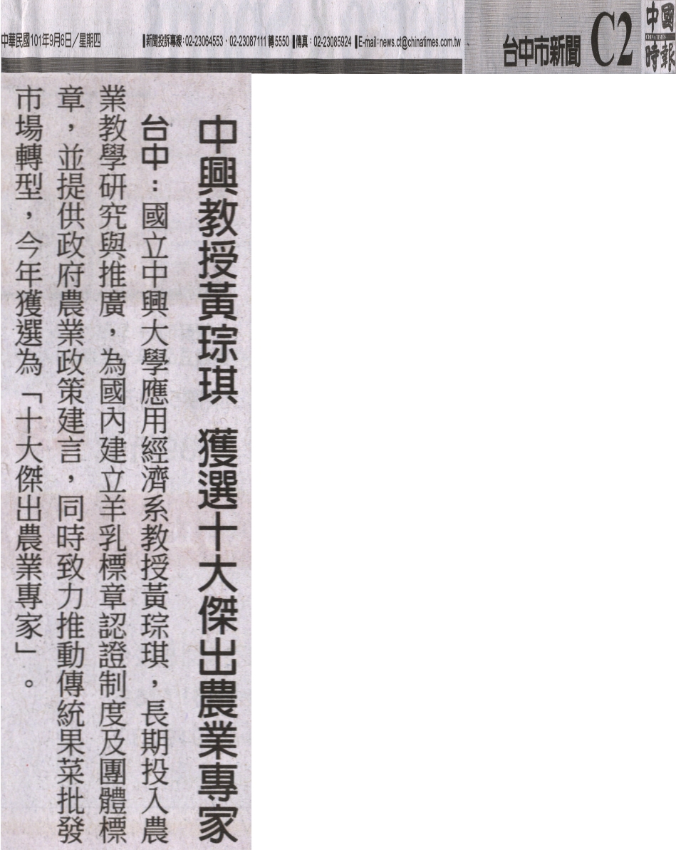 台中:國立中興大學應用經濟系教授黃琮琪,長期投入農業教學研究與推廣,為國內建立羊乳標章認證制度及團體標章,並提供政府農業政策建言,同時致力推動傳統果菜批發市場轉型,今年獲選為「十大傑出農業專家」。