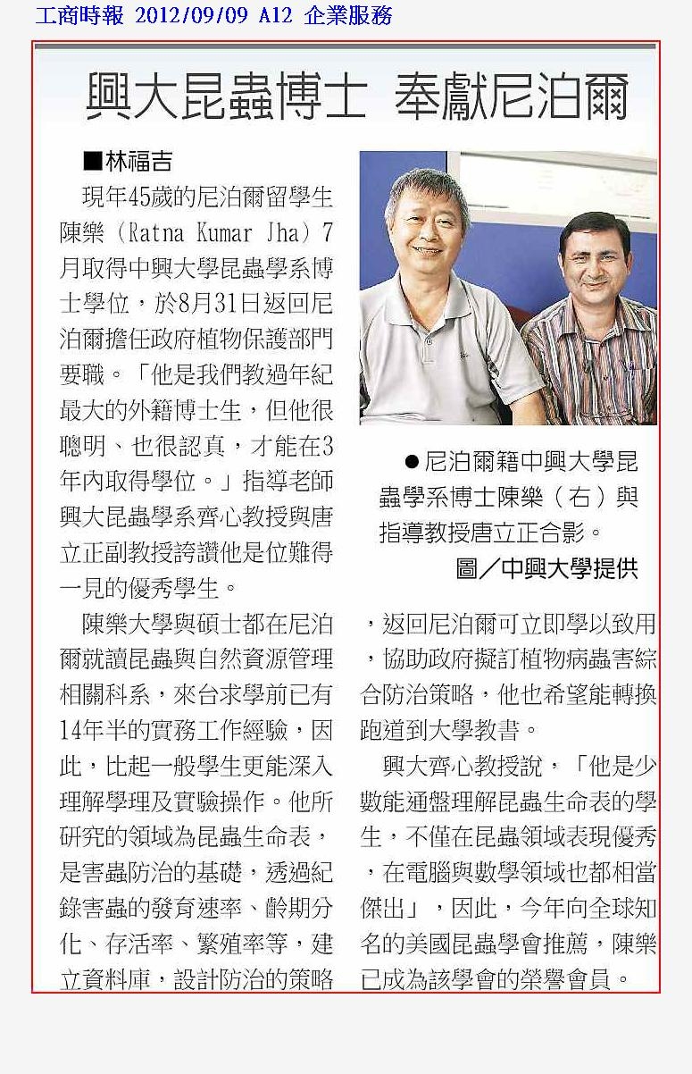 現年45歲的尼泊爾留學生陳樂(Ratna Kumar Jha)7月取得中興大學昆蟲學系博士學位,於8月31日返回尼泊爾擔任政府植物保護部門要職。