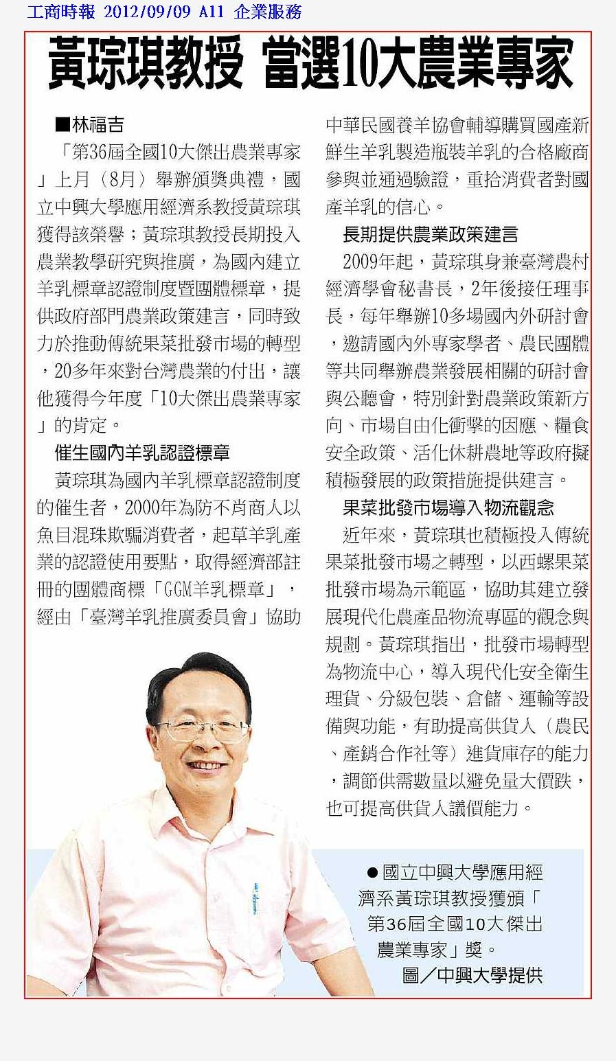 「第36屆全國10大傑出農業專家」上月(8月)舉辦頒獎典禮,國立中興大學應用經濟系教授黃琮琪獲得該榮譽;黃琮琪教授長期投入農業教學研究與推廣,為國內建立羊乳標章認證制度暨團體標章,提供政府部門農業政策建言,同時致力於推動傳統果菜批發市場的轉型,20多年來對台灣農業的付出,讓他獲得今年度「10大傑出農業專家」的肯定。