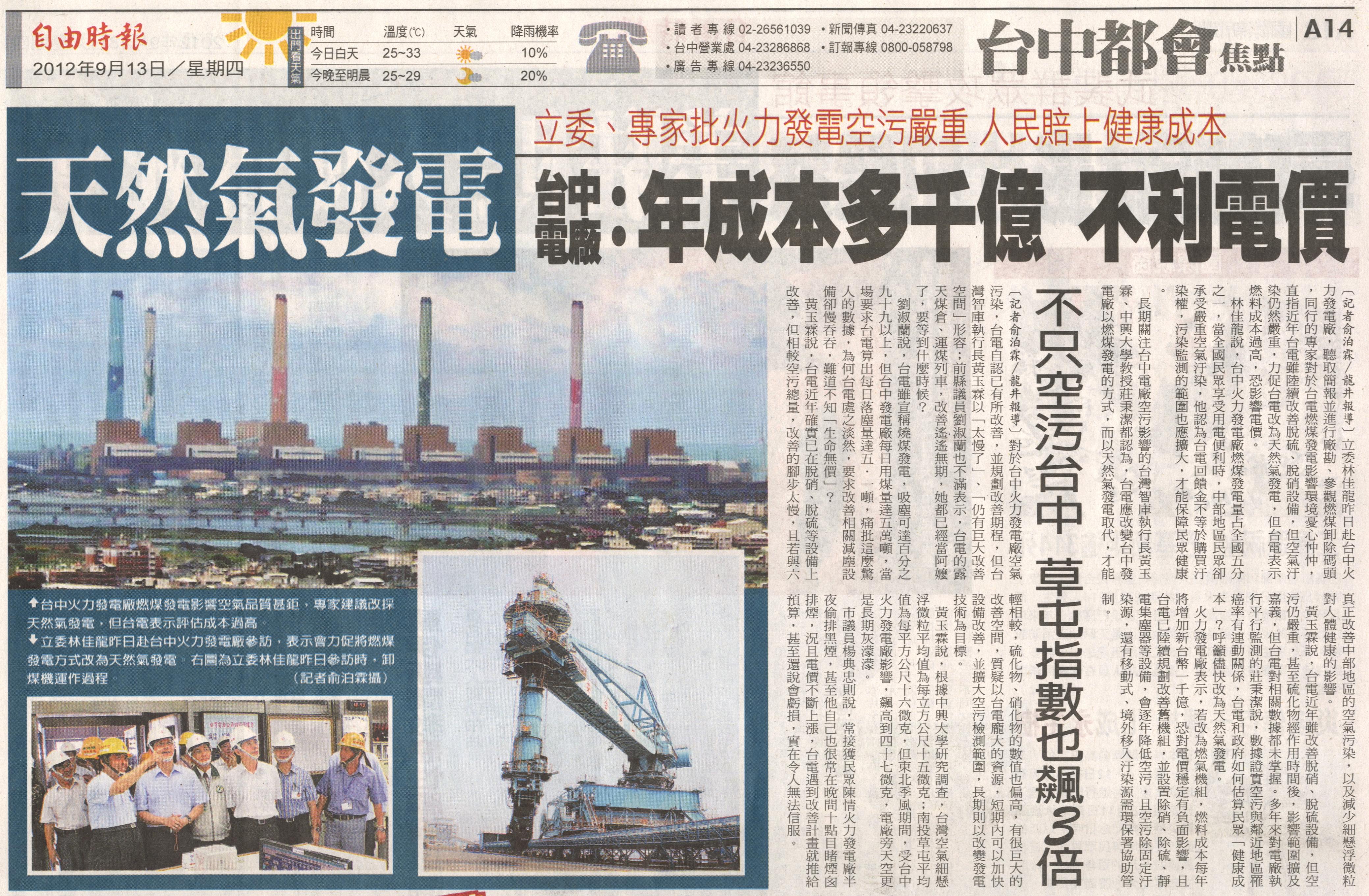 立委林佳龍昨日赴台中火力發電廠,聽取簡報並進行廠勘、參觀燃煤卸除碼頭,同行的專家對於台電燃煤發電影響環境憂心忡忡,直指近年台電雖陸續改善脫硫、脫硝設備,但空氣汙染仍然嚴重,力促台電改為天然氣發電,但台電表示燃料成本過高,恐影響電價。