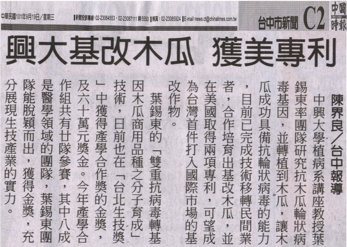 中興大學植病系講座教授葉錫東率團隊研究抗木瓜輪狀病毒基因,並轉植到木瓜,讓木瓜成功具備抗輪狀病毒的能力,目前已完成技術移轉民間業者,合作培育出基改木瓜,並在美國取得兩項專利,可望成為台灣首件打入國際市場的基改作物。