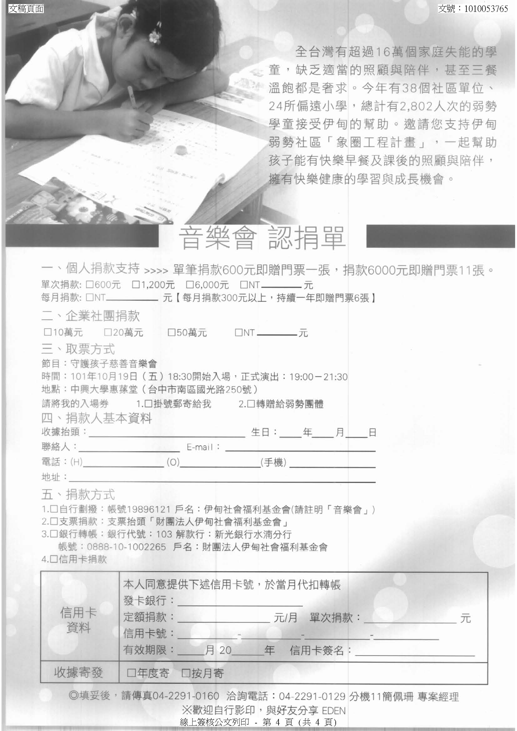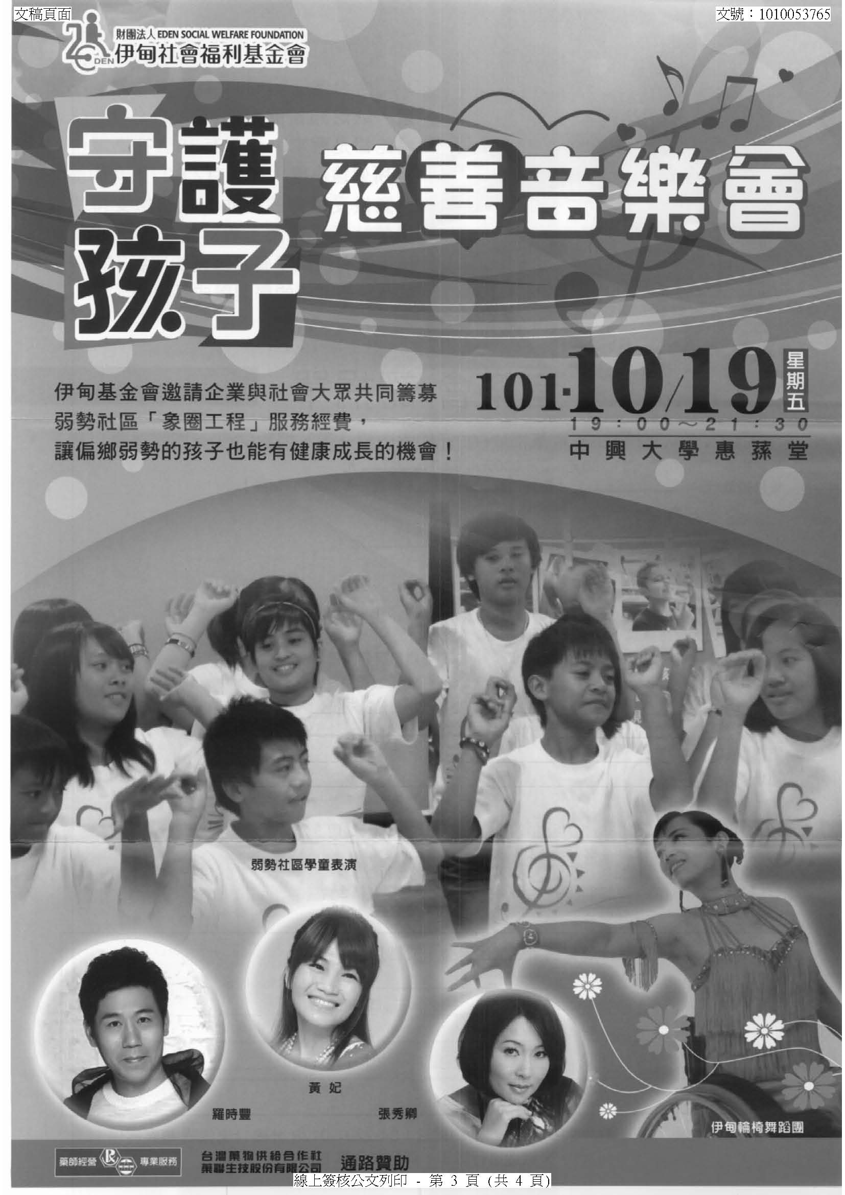 - 相關附件 101.09.25_財團法人伊甸社會福利基金會守護孩子音樂會 1.jpg 、 101.09.25_財團法人伊甸社會福利基金會守護孩子音樂會 2.jpg