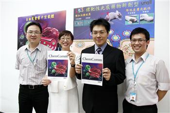 興大化學系賴秉杉副教授(右2)與工研院材化所王先知副所長(右3)28日共同發表光感藥物奈米新劑型,可有效提高療效、降低副作用 |
