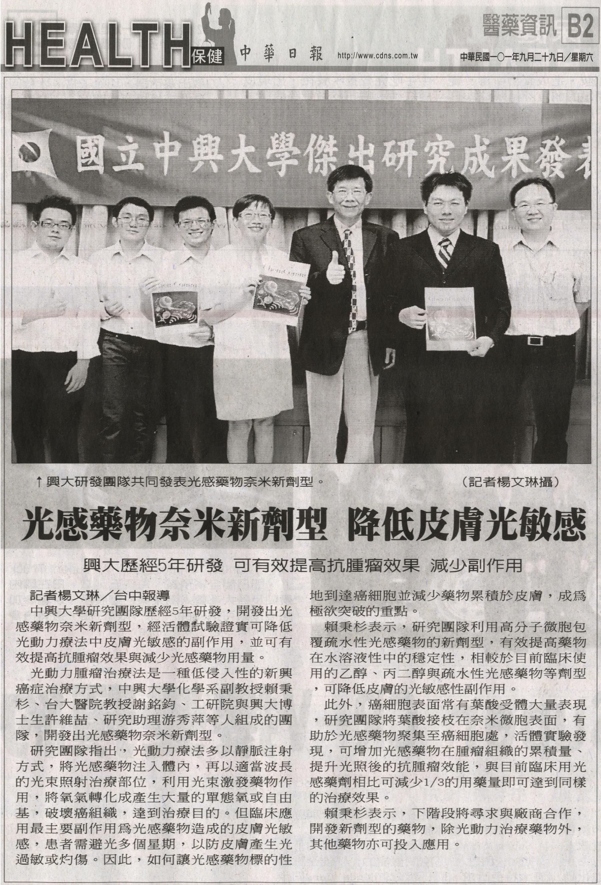 光動力腫瘤治療法是一種低侵入性的新興癌症治療方式,中興大學化學系副教授賴秉杉、台大醫院教授謝銘鈞、工研院與興大博士生許維喆、研究助理游秀萍等人組成的團隊,開發出光感藥物奈米新劑型。
