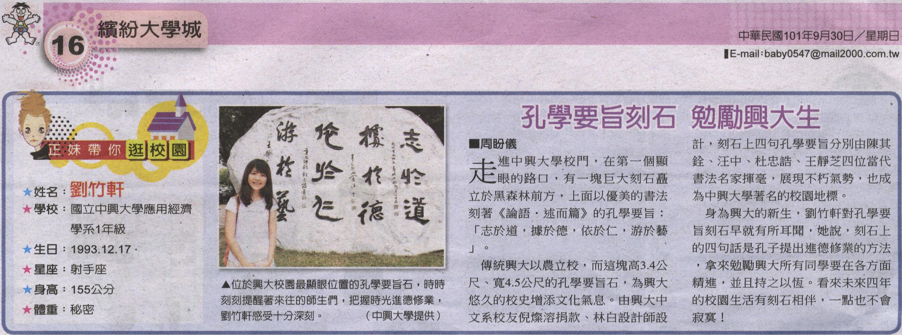 身為興大的新生,劉竹軒對孔學要旨刻石早就有所耳聞,她說,刻石上的四句話是孔子提出進德修業的方法,拿來勉勵興大所有同學要在各方面精進,並且持之以恆。看來未來四年的校園生活有刻石相伴,一點也不會寂寞!