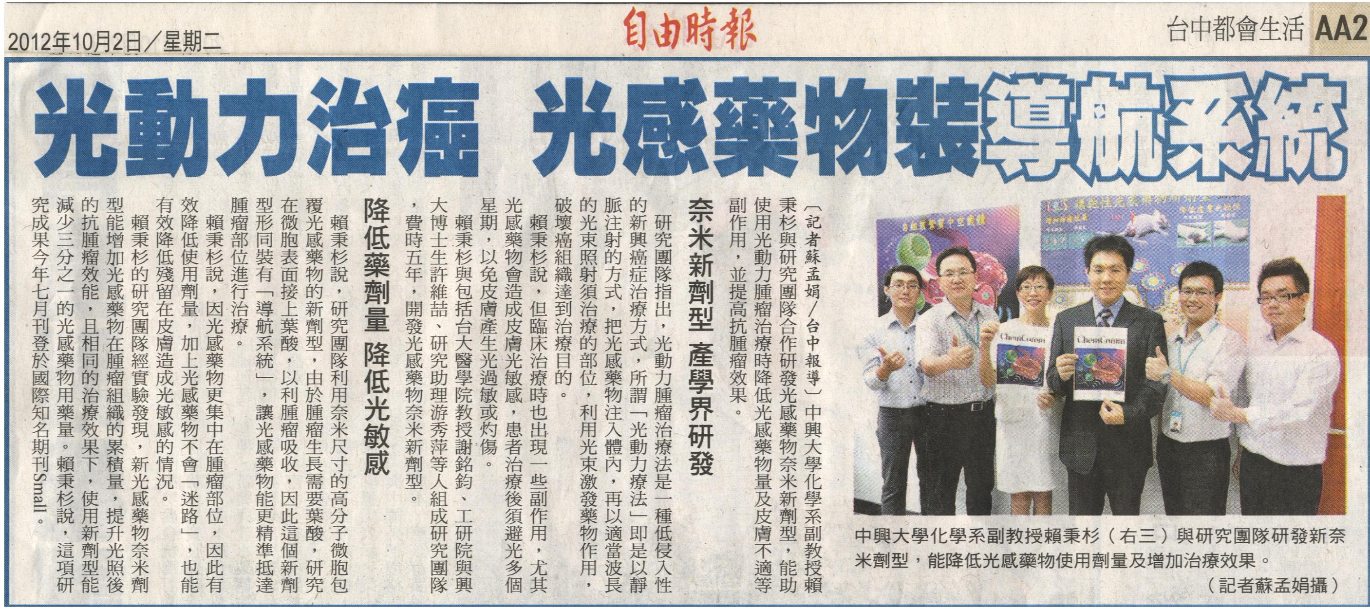 中興大學化學系副教授賴秉杉與研究團隊合作研發光感藥物奈米新劑型,能助使用光動力腫瘤治療時降低光感藥物量及皮膚不適等副作用,並提高抗腫瘤效果。