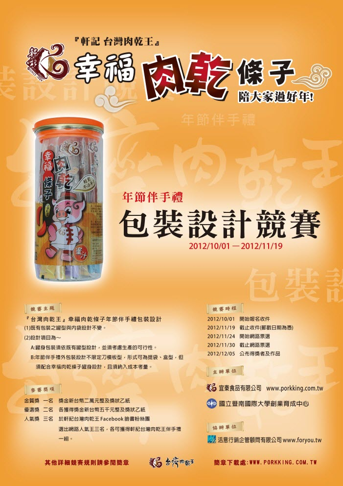 軒記 台灣肉乾王為推廣台灣本土肉乾食用文化,讓肉乾美味不斷結合新創意,2011年以[肉乾怎麼吃?!]為主軸舉辦肉乾吃法的創意競賽,2012年創新研發出吃美味肉乾~不沾手的『幸福肉乾條子』新商品,並舉辦全國性[“台灣肉乾 怎麼賣才是王道” 創意行銷實戰競賽]。為了迎接2013年新春來臨,將推出幸福肉乾條子年節伴手禮做為【台灣肉乾王】品牌風雲商品,特此廣發英雄帖,邀請各方設計好手大顯神通,設計出能傳遞我們對親友拜年祝福的幸福肉乾條子過年最佳伴手禮。