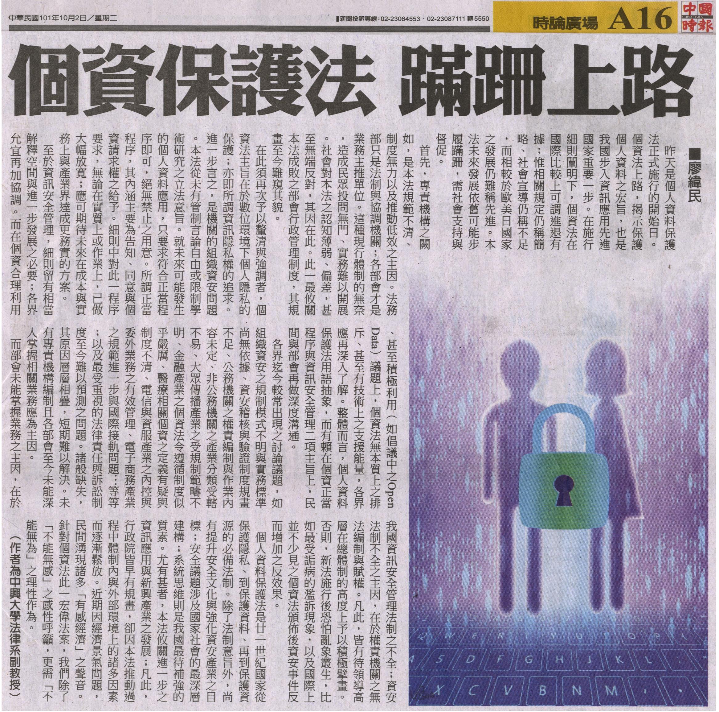 昨天是個人資料保護法正式施行的開始日。個資法上路,揭示保護個人資料之宏旨,也是我國步入資訊應用先進國家重要一步。在施行細則闡明下,個資法在國際比較上可謂進退有據;惟相關規定仍稱簡略、社會宣導仍稱不足,而相較於歐美日國家之發展仍難稱先進。本法未來發展依舊可能步履蹣跚,需社會支持與督促。