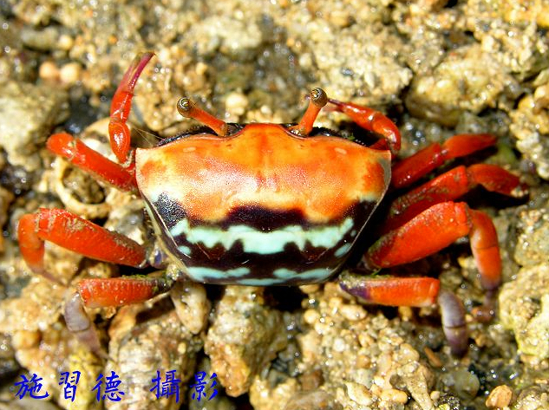 ![]() 麗彩招潮體色為深藍、淡藍或灰白,有數條橫向黑帶,大螯胭脂紅或橙色、兩指淡粉紅或白,眼柄淡紅或橘紅(施習德攝) ![]() 部分雌蟹前背甲為橘紅色(施習德攝) |
