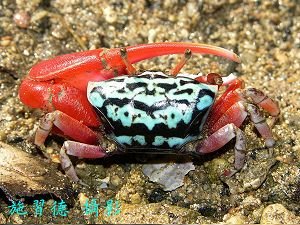 施習德教授表示,麗彩招潮與粗腿招潮的區別,在於前者的背甲前側緣明顯,且彎向背側緣;眼柄帶紅色;背甲多為藍底,有黑色橫帶,部分雌蟹前背甲為橘紅色。