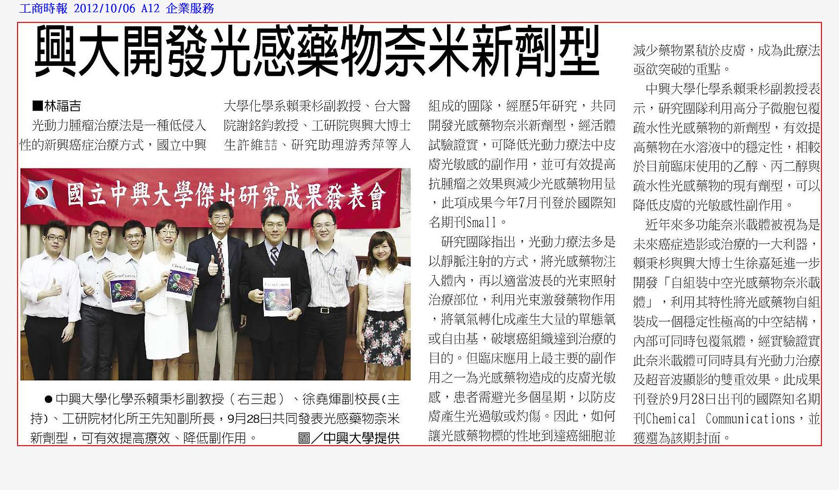 光動力腫瘤治療法是一種低侵入性的新興癌症治療方式,國立中興大學化學系賴秉杉副教授、台大醫院謝銘鈞教授、工研院與興大博士生許維(吉吉)、研究助理游秀萍等人組成的團隊,經歷5年研究,共同開發光感藥物奈米新劑型,經活體試驗證實,可降低光動力療法中皮膚光敏感的副作用,並可有效提高抗腫瘤之效果與減少光感藥物用量,此項成果今年7月刊登於國際知名期刊Small。
