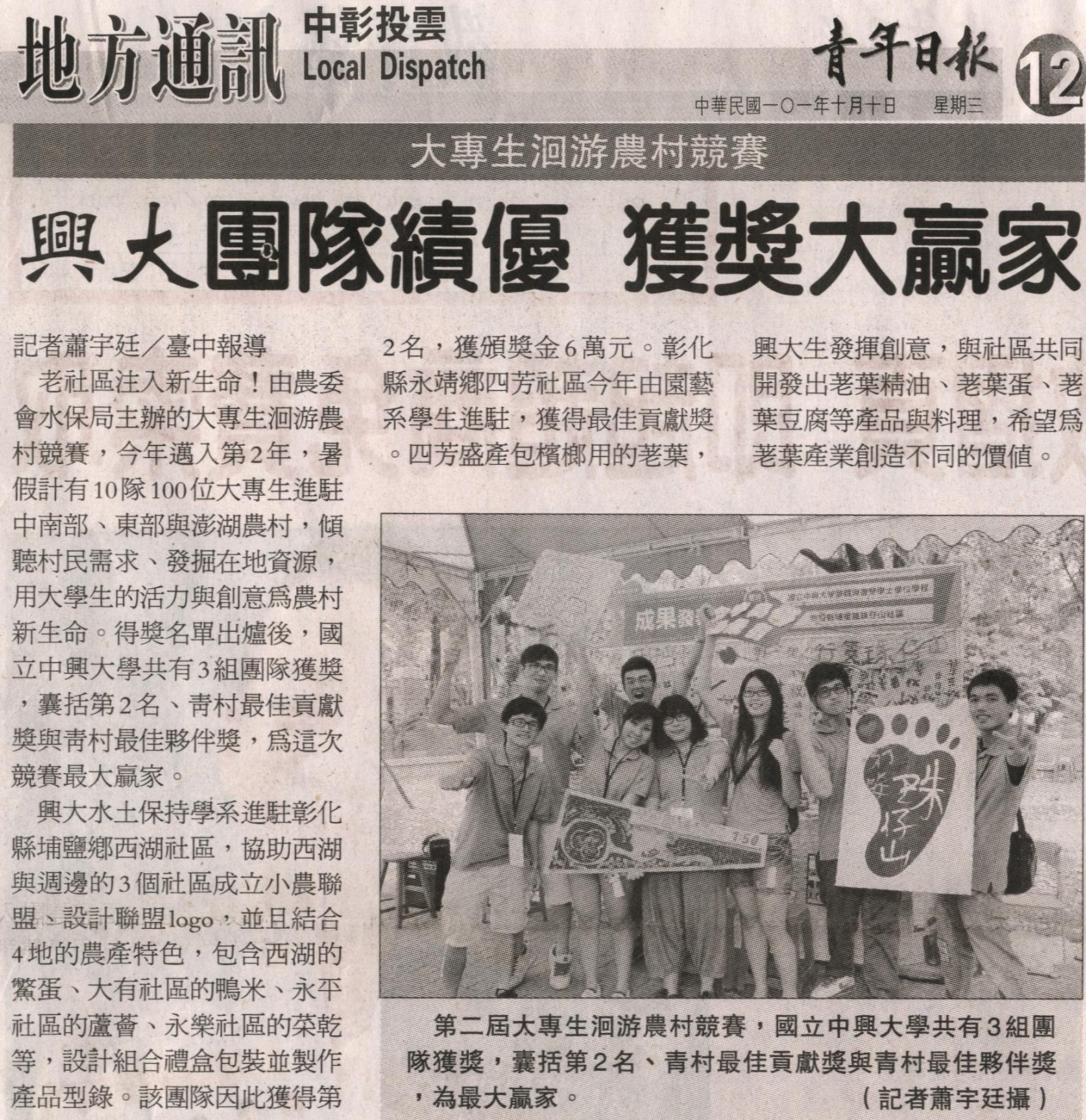 老社區注入新生命!由農委會水保局主辦的大專生洄游農村競賽,今年邁入第2年,暑假計有10隊100位大專生進駐中南部、東部與澎湖農村,傾聽村民需求、發掘在地資源,用大學生的活力與創意為農村新生命。得獎名單出爐後,國立中興大學共有3組團隊獲獎,囊括第2名、青村最佳貢獻獎與青村最佳夥伴獎,為這次競賽最大贏家。