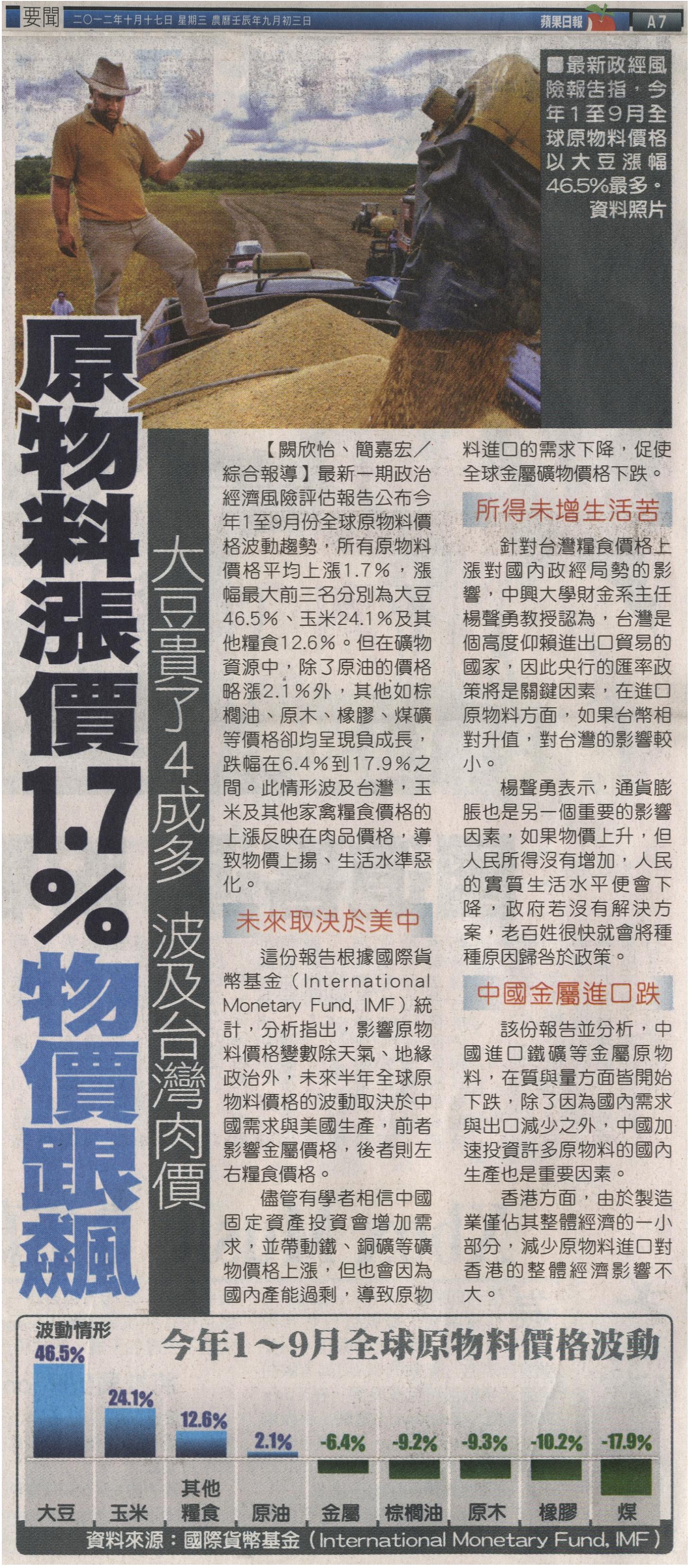 最新一期政治經濟風險評估報告公布今年1至9月份全球原物料價格波動趨勢,所有原物料價格平均上漲1.7%,漲幅最大前三名分別為大豆46.5%、玉米24.1%及其他糧食12.6%。但在礦物資源中,除了原油的價格略漲2.1%外,其他如棕櫚油、原木、橡膠、煤礦等價格卻均呈現負成長,跌幅在6.4%到17.9%之間。此情形波及台灣,玉米及其他家禽糧食價格的上漲反映在肉品價格,導致物價上揚、生活水準惡化。