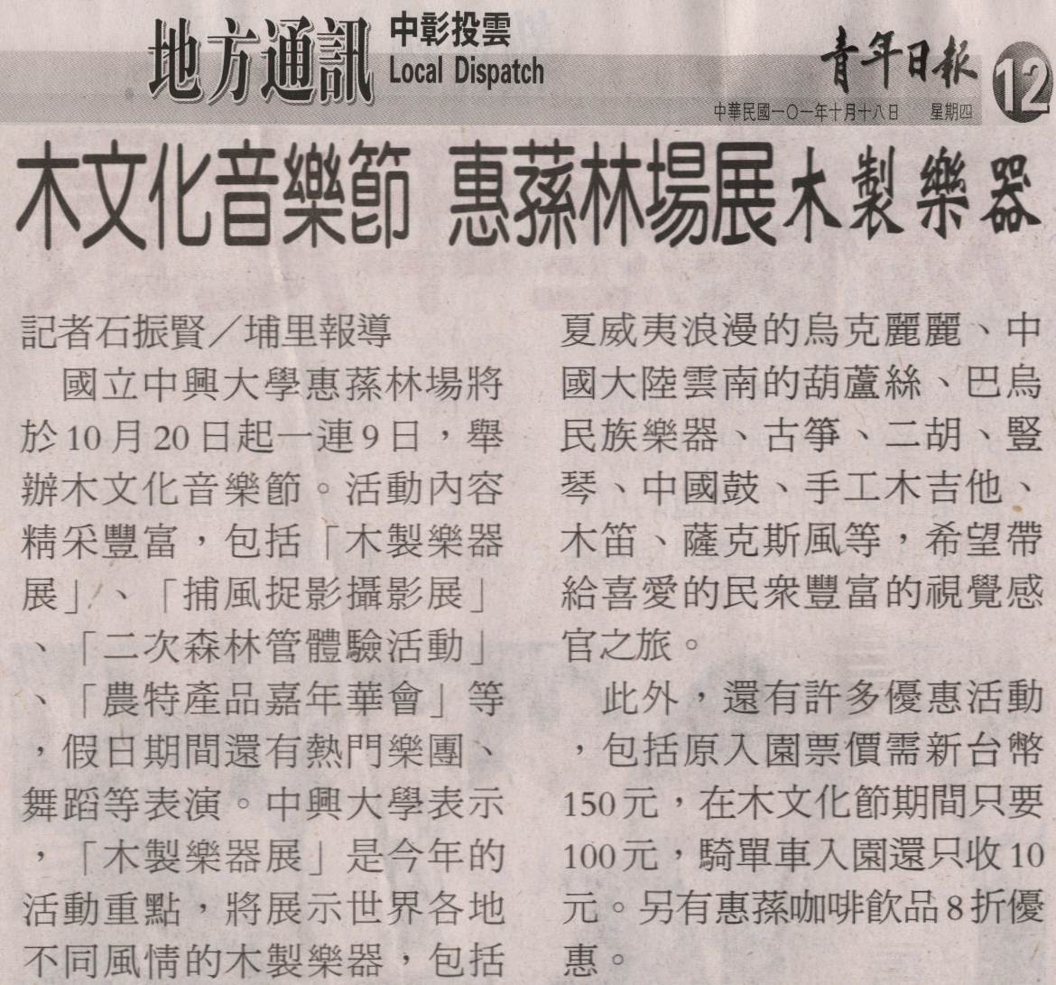 國立中興大學惠蓀林場將於10月20日起一連9日,舉辦木文化音樂節。活動內容精采豐富,包括「木製樂器展」、「捕風捉影攝影展」、「二次森林管體驗活動」、「農特產品嘉年華會」等,假日期間還有熱門樂團、舞蹈等表演。中興大學表示,「木製樂器展」是今年的活動重點,將展示世界各地不同風情的木製樂器,包括夏威夷浪漫的烏克麗麗、中國大陸雲南的葫蘆絲、巴烏民族樂器、古箏、二胡、豎琴、中國鼓、手工木吉他、木笛、薩克斯風等,希望帶給喜愛的民眾豐富的視覺感官之旅。