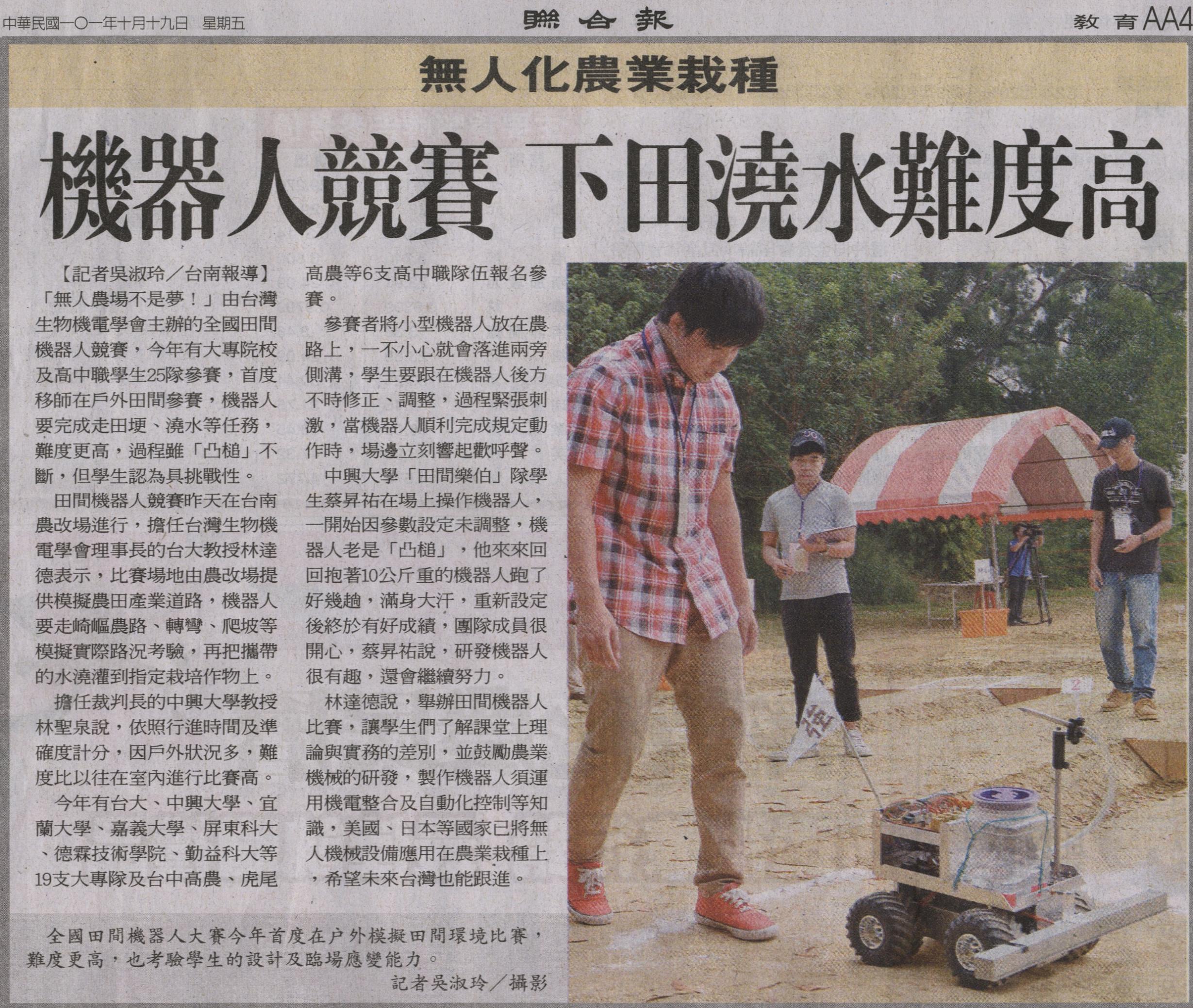 林達德說,舉辦田間機器人比賽,讓學生們了解課堂上理論與實務的差別,並鼓勵農業機械的研發,製作機器人須運用機電整合及自動化控制等知識,美國、日本等國家已將無人機械設備應用在農業栽種上,希望未來台灣也能跟進。
