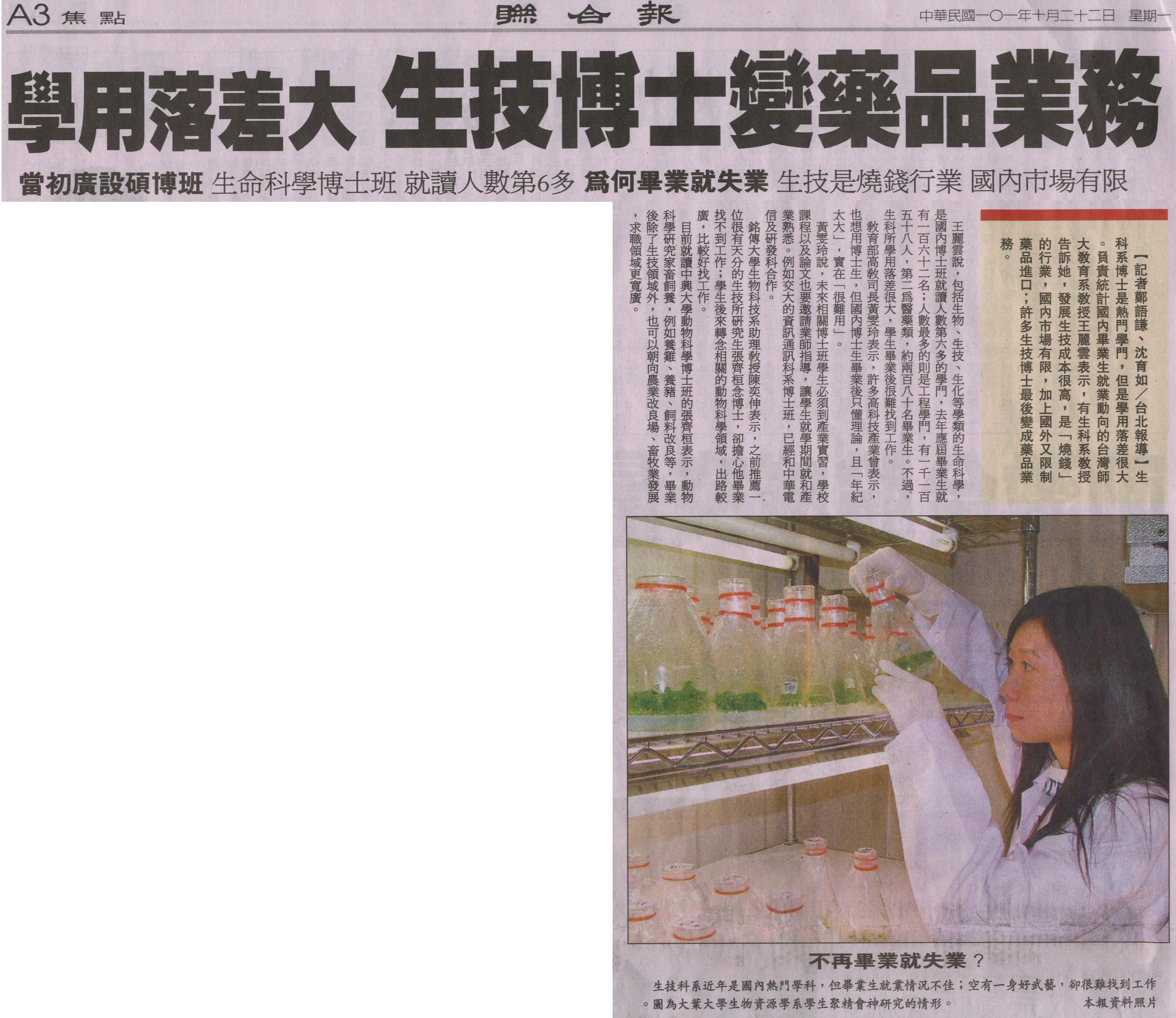 銘傳大學生物科技系助理教授陳奕伸表示,之前推薦一位很有天分的生技所研究生張齊桓念博士,卻擔心他畢業找不到工作;學生後來轉念相關的動物科學領域,出路較廣,比較好找工作。
