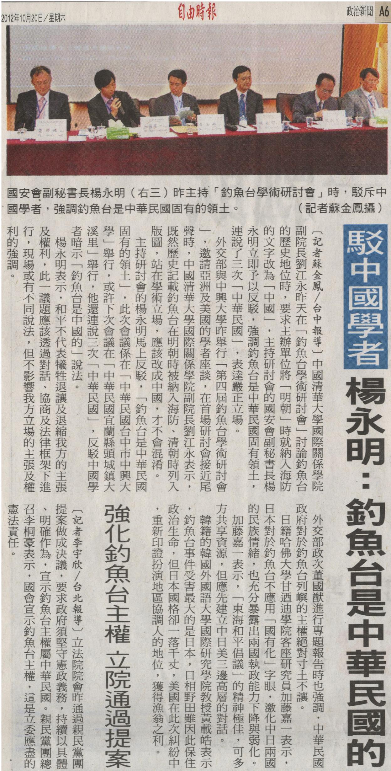 中國清華大學國際關係學院副院長劉江永昨天在「釣魚台學術研討會」討論釣魚台的歷史地位時,要求主辦單位將「明朝」時就納入海防的文字改為「中國」,主持研討會的國安會副秘書長楊永明立即予以反駁,強調釣魚台是中華民國固有領土,連說了三次「中華民國」,表達嚴正立場。